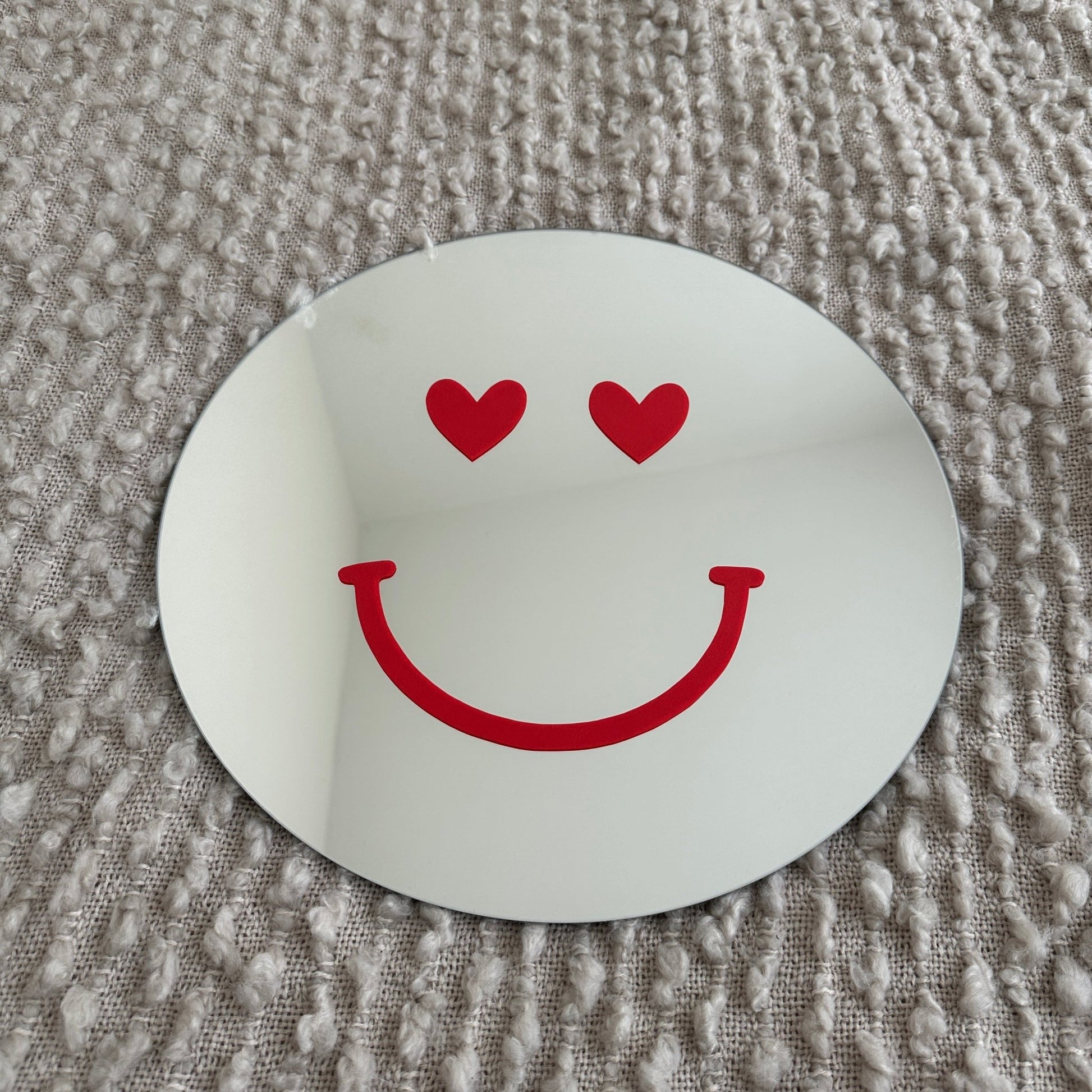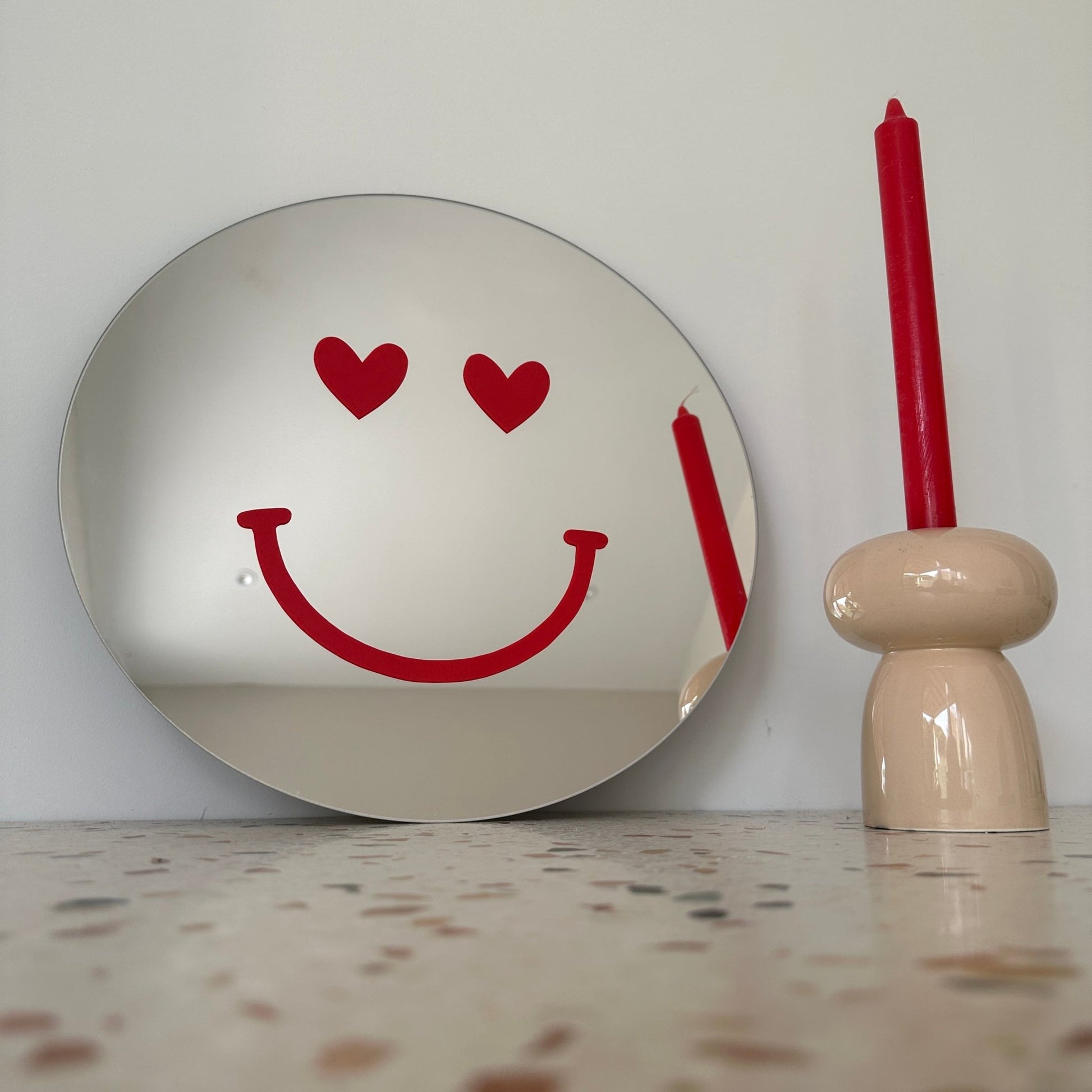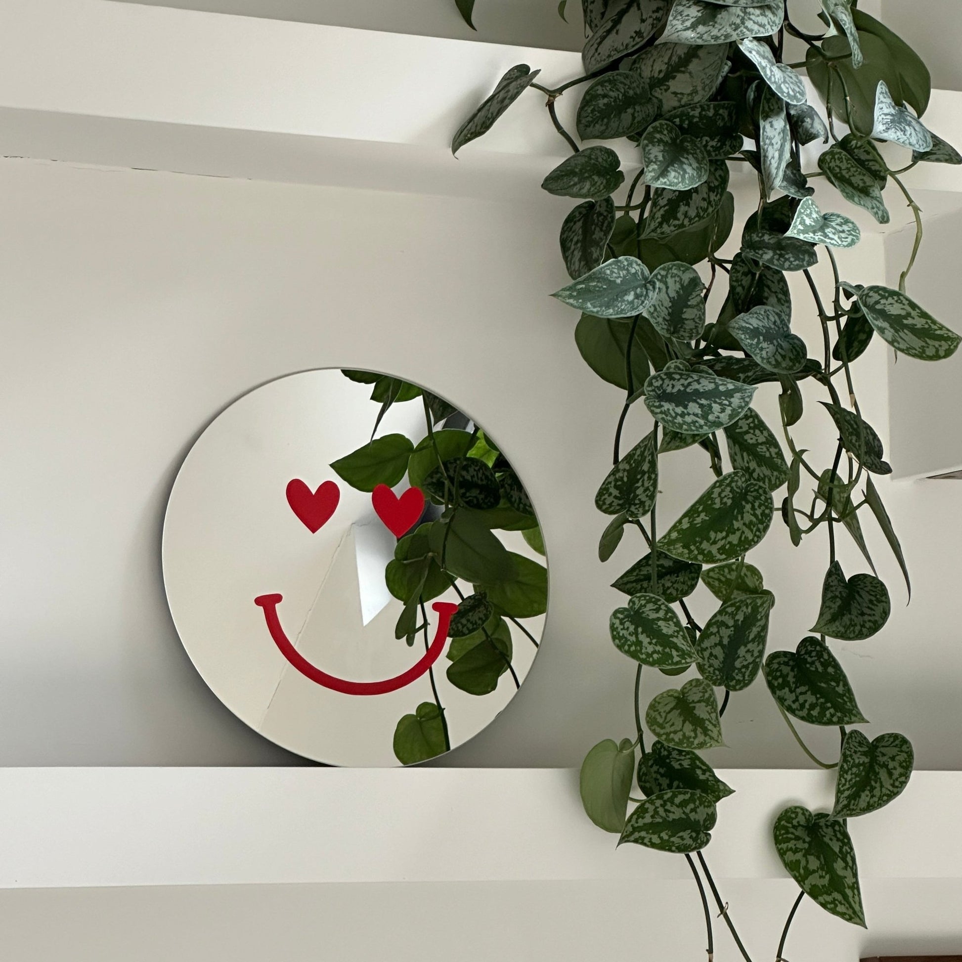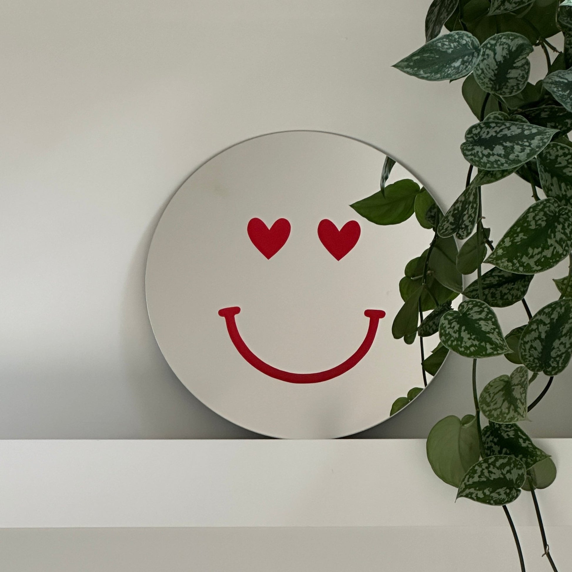 Imagine that boring wall or empty shelf getting an upgrade with this radiant beauty. The big red smiley stands out, playful and vibrant. Whether it's the kids' room that needs a dose of charm, or your own cozy spot that's crying out for a little fun - this mirror is the answer.