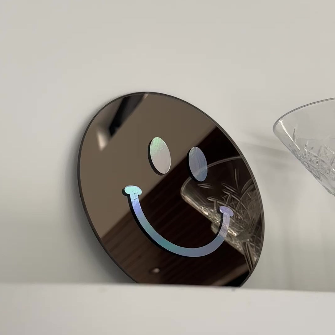 Imagine: that boring wall or empty shelf gets an upgrade with this radiant beauty. The little holographic smiley stands out, playful and vibrant, against the mirror background. Whether it's the kids' room in need of a dose of charm, or your own cozy spot crying out for a little fun - this mirror is the answer.